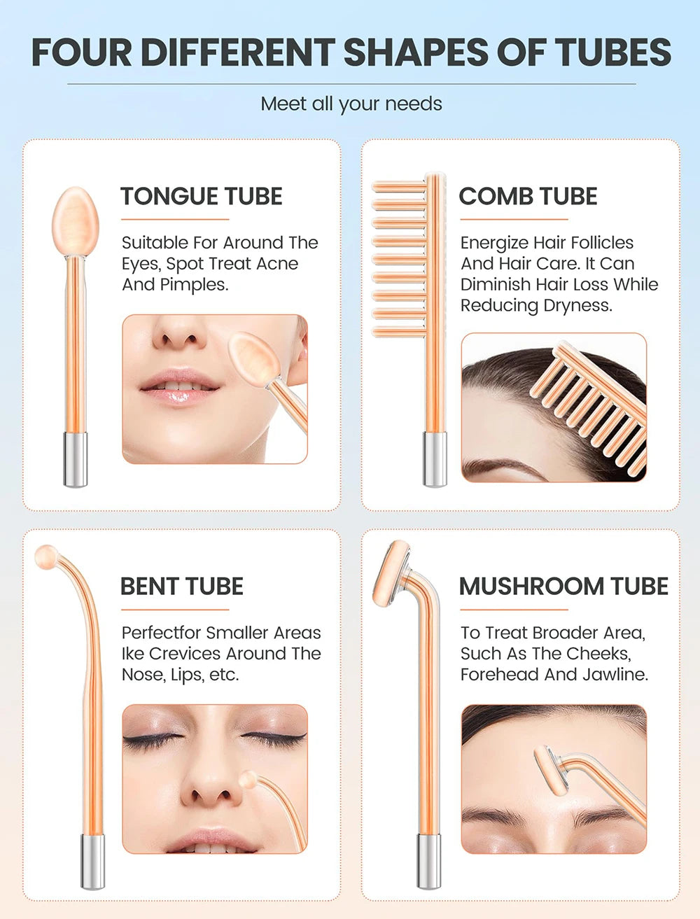 【Multifunctional 4 Different Tubes】High frequency facial machine comes with 4 different orange high frequency wands to meet all your needs, 1 x mushroom tube, 1 x tongue tube; 1 x bent tube; 1 x another tube. It can be applied to different areas. The mushroom tube is suitable for larger areas around the face; the tongue tube and the bend tube are suitable for smaller areas of the face.Day after day,you will see a better version of yourself!